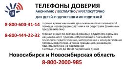 В городе Новосибирске работает телефон доверия: 8 (383) 276-35-16, 8 (383) 204 -90-95 Филиал ГБУ НСО «ОЦДК»: Татарский Телефон: 8(383 64) 20 841 E-mail: tatarsk_ocdk@edu54.ru Адрес: 632122, г. Татарск, ул. Матросова, 3